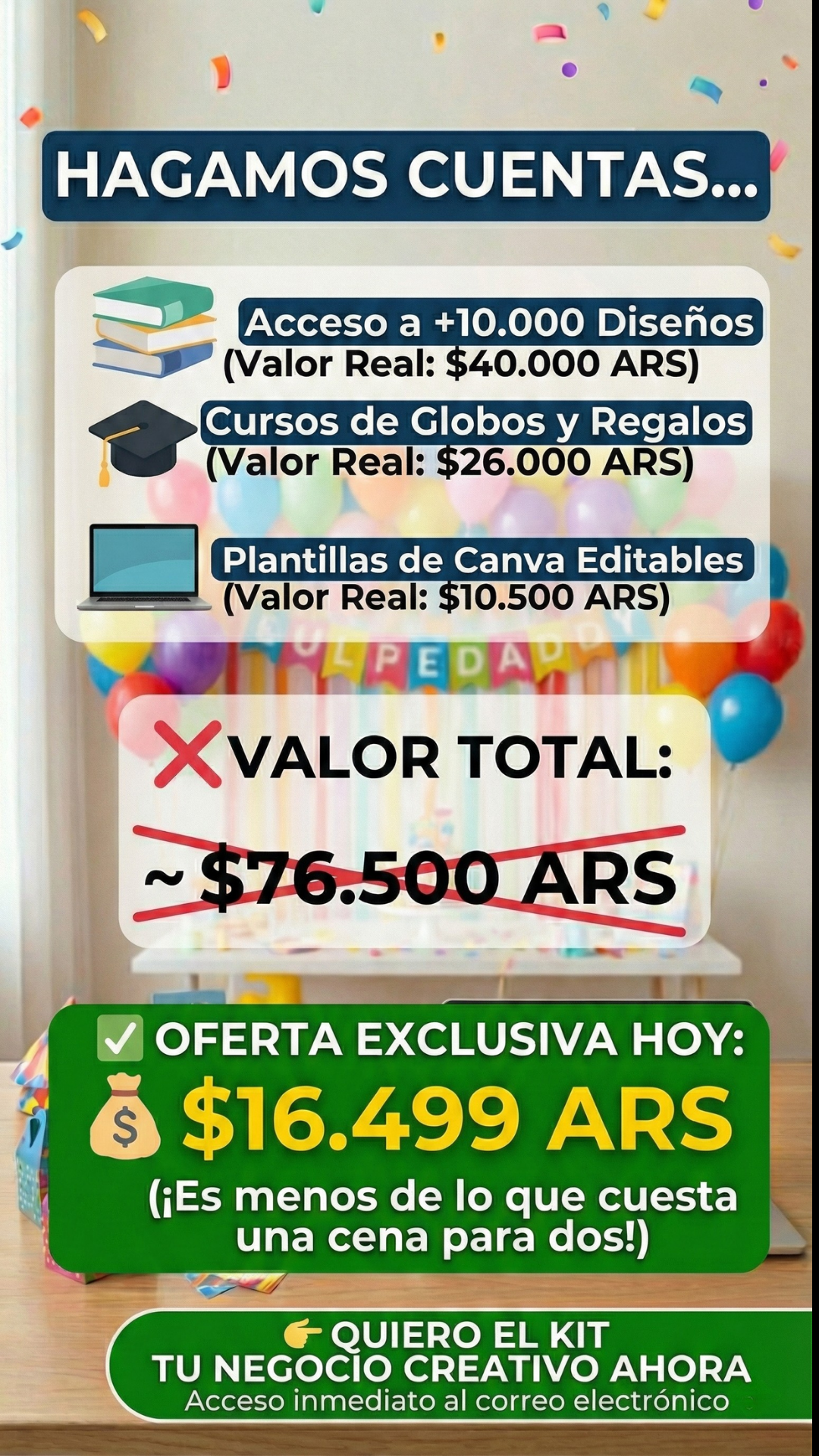 ¡Es un pago único! Abonas $16.499 ARS y el acceso a los +10.000 diseños, plantillas y todos los bonos es tuyo de por vida. Sin sorpresas ni cargos ocultos.